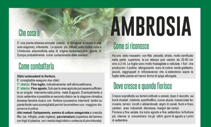 Al fine di contenere la presenza della pianta infestante di “Ambrosia Aremiisifolia” sul territorio comunale, il cui polline causa importanti allergie ai soggetti sensibili, in ottemperanza alla D.G.R. n. 25522/99 e ai sensi dell’ ordinanza n.97 del 20-06-2022, con la presente si chiede a tutti i proprietari delle aree verdi di vigilare sull’eventuale presenza di Ambrosia ed eseguire sulle aree verdi periodici interventi di manutenzione e pulizia rispettando le seguenti indicazioni: