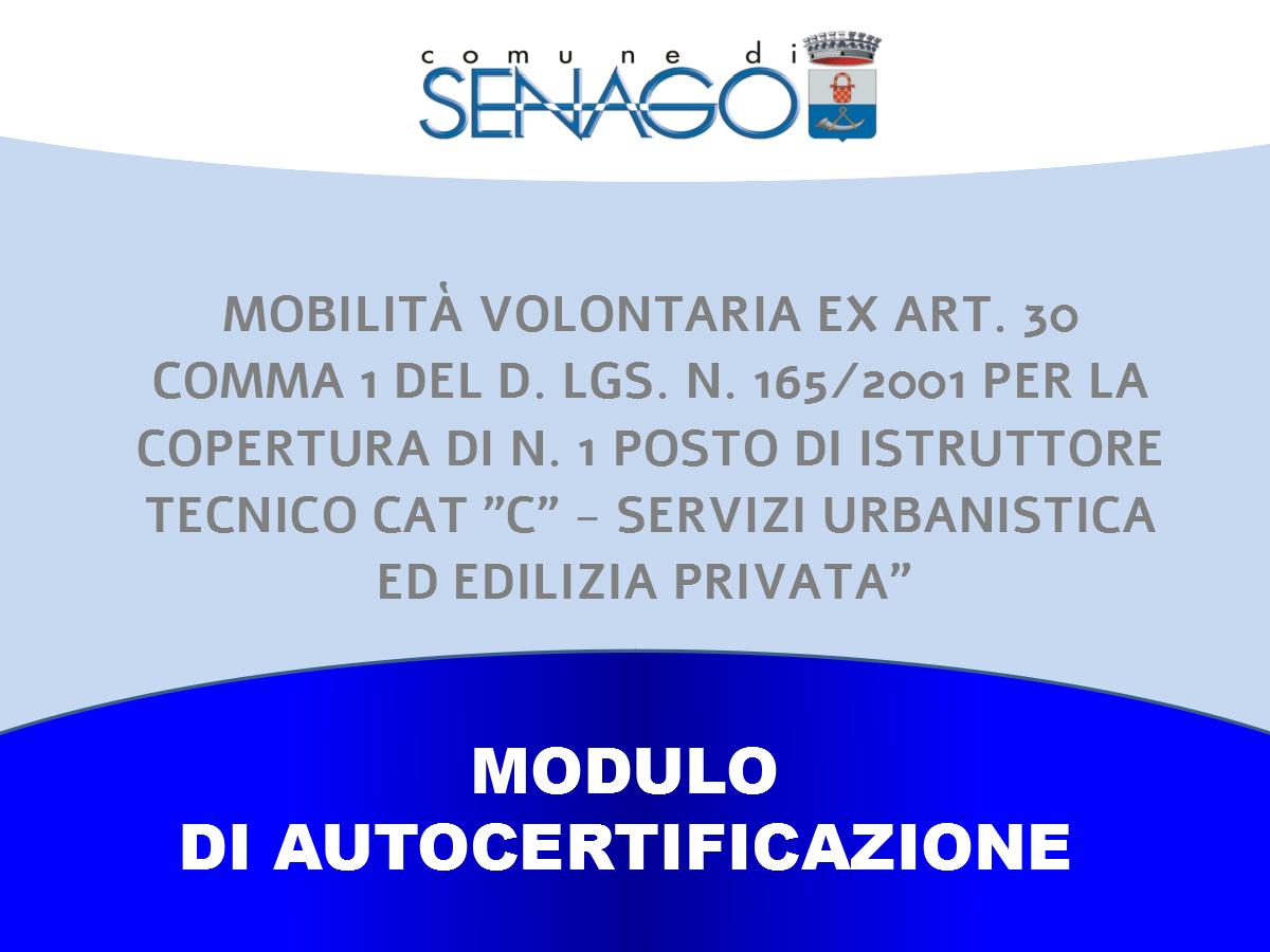 Modulo autocertificazione: MOBILITÀ EX ART. 30 DEL D.LGS 165/2001 PER LA COPERTURA DI N. 1 POSTO DI ISTRUTTORE TECNICO CAT. C – SERVIZI URBANISTICA E EDILIZIA URBANISTICA SETTORE SERVIZI TERRITORIALI