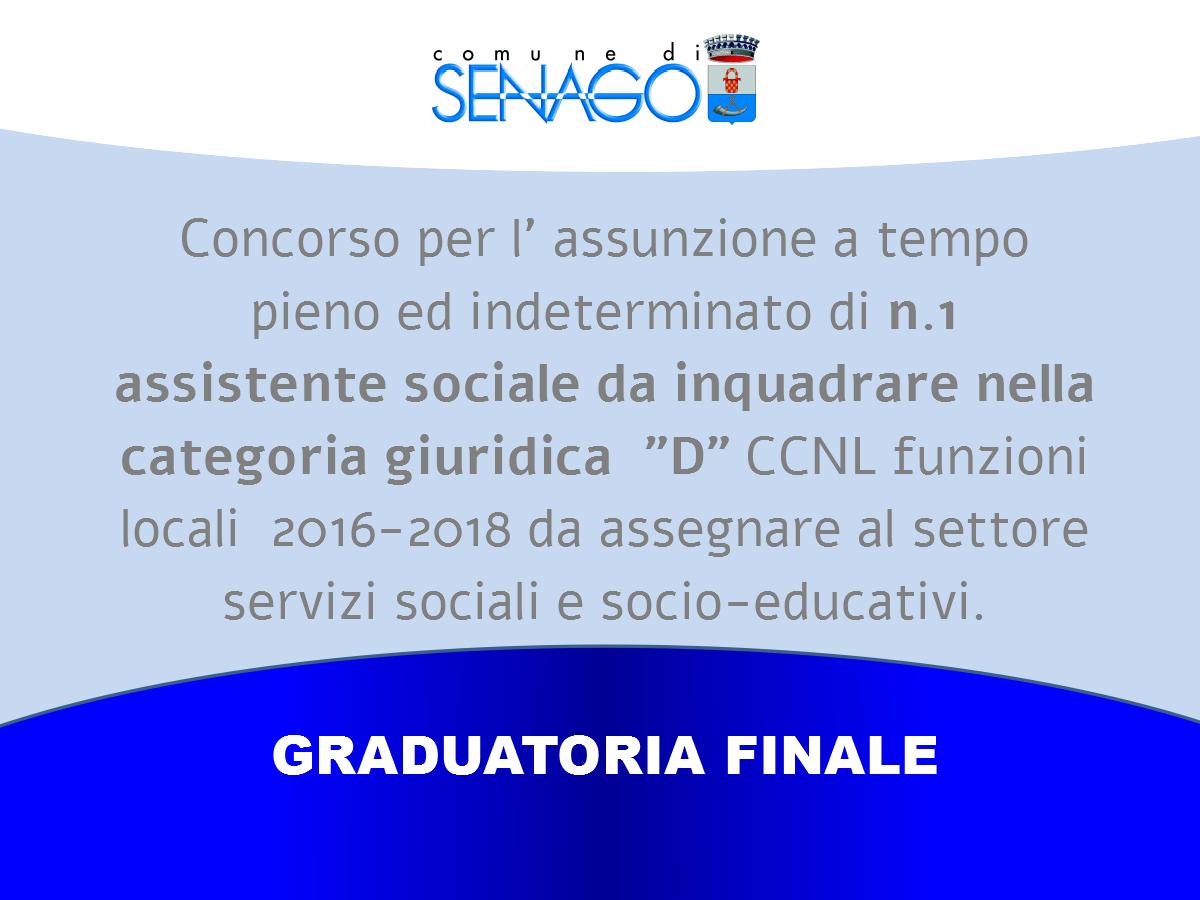 Si rende noto in allegato la graduatoria finale del concorso per l’ assunzione a tempo pieno ed indeterminato di n.1 assistente sociale da inquadrare nella categoria giuridica “D” CCNL funzioni locali 2016-2018 da assegnare al settore servizi sociali e socio-educativi