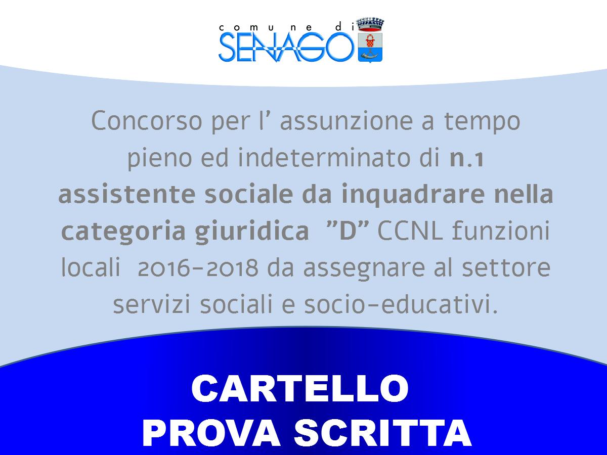 Cartello prova scritta CONCORSO PER L’ASSUNZIONE A TEMPO PIENO ED INDETERMINATO DI N. 1 ASSISTENTE SOCIALE DA INQUADRARE NELLA CATEGORIA GIURIDICA “D” CCNL FUNZIONI LOCALI 2016-2018 DA ASSEGNARE AL SETTORE SERVIZI SOCIALI E SOCIO-EDUCATIVI