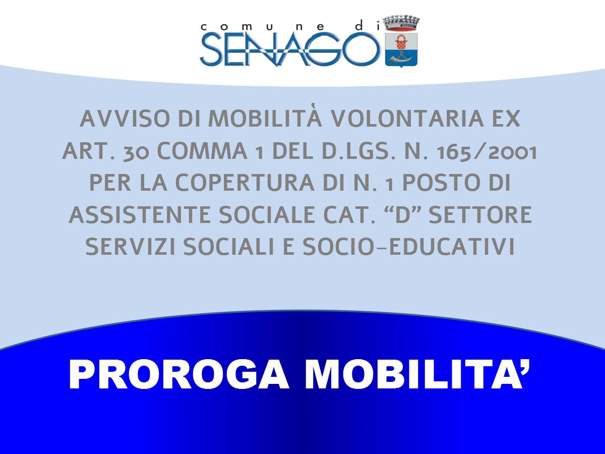 Proroga MOBILITÀ VOLONTARIA EX ART. 30 COMMA 1 DEL D.LGS. N. 165/2001 PER LA COPERTURA DI N. 1 POSTO DI ASSISTENTE SOCIALE CAT. “D” SETTORE SERVIZI SOCIALI E SOCIO-EDUCATIVI