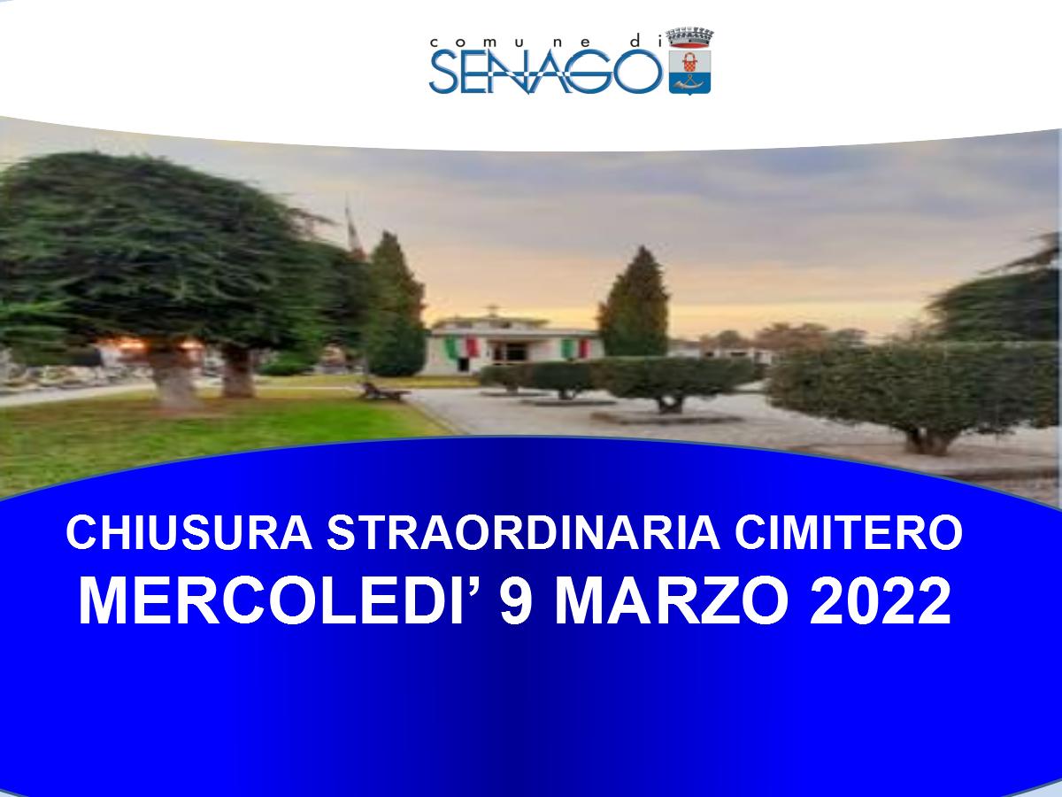 “CHIUSURA STRAORDINARIA AL PUBBLICO DEL CIMITERO COMUNALE NELLA GIORNATA DI MERCOLEDÌ 09 MARZO 2022 PER CONSENTIRE DI ESEGUIRE LE OPERAZIONI DI ESUMAZIONE ED ESTUMULAZIONE ORDINARIA IN SICUREZZA”