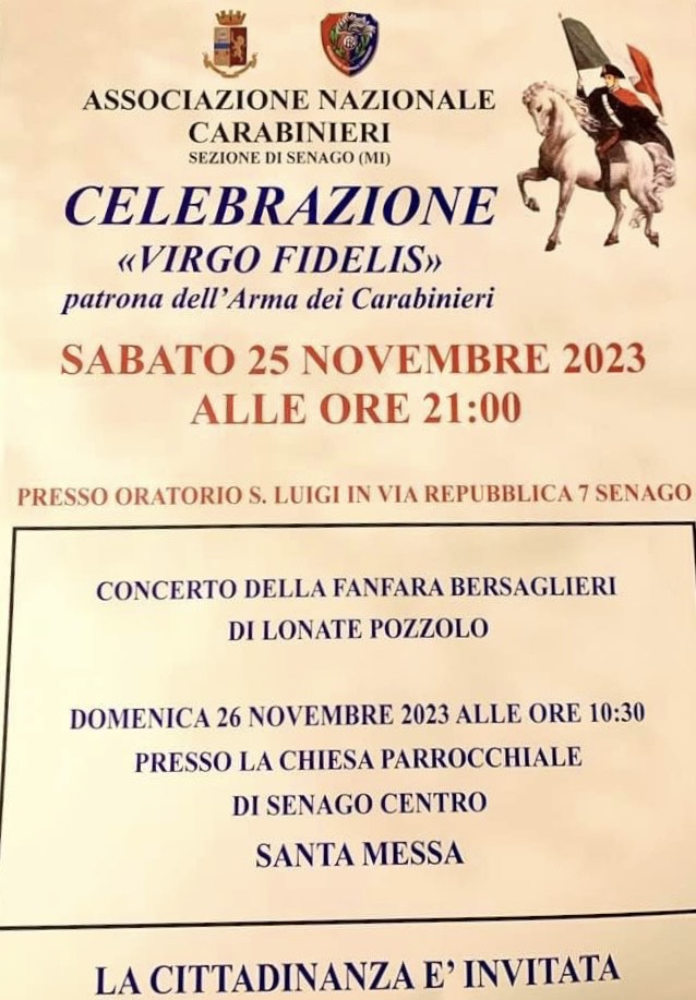 L‘Associazione Nazionale Carabinieri, Sezione di Senago, invita tutti i cittadini a partecipare al Concerto in occasione della ricorrenza della “Virgo Fidelis“, patrona dell´Arma.