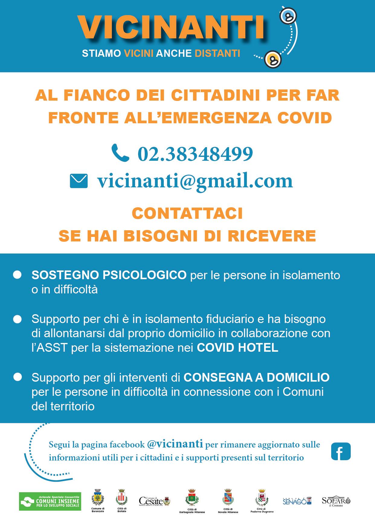 Il Comune di Senago, con altri Comuni dell’ambito e con l’Azienda Speciale Consortile Comuni Insieme, ha aderito all’iniziativa “VICINANTI, stiamo vicini anche distanti“, che offre un servizio di supporto alla cittadinanza in emergenza Coronarivus; a tal fine sono stati attivati un numero telefonico ed un indirizzo email dedicati: