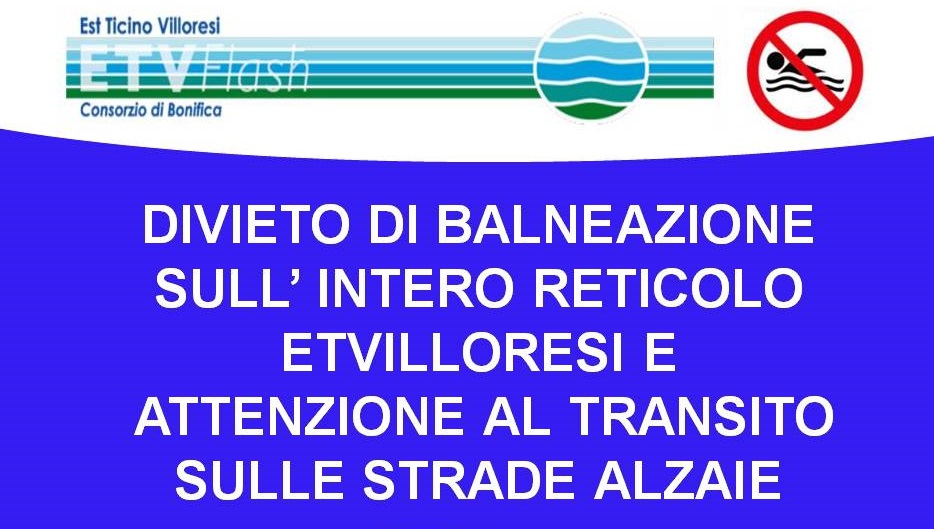 Il Sindaco Magda Beretta e l’ Amministrazione Comunale si uniscono all’ appello espresso dal Consorzio di bonifica Est Ticino Villoresi (ETVilloresi) relativamente al divieto di Balneazione che vige sull’intero reticolo ETVilloresi e all’ attenzione al transito sulle strade alzaie, nel rispetto dell’ incolumità pubblica e della sicurezza–> RITORNANO I TUFFI NEI CANALI MA IL DIVIETO DI BALNEAZIONE È ASSOLUTO