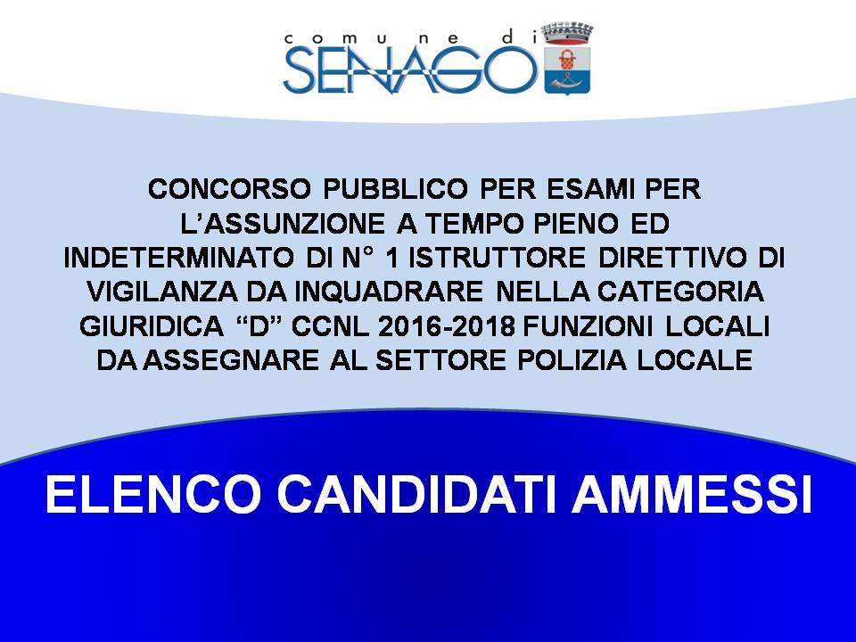 Si allega l’elenco dei candidati ammessi al concorso per esame di n. 1 Istruttore Direttivo di Vigilanza Cat. “D”, da destinare al Settore di Polizia Locale