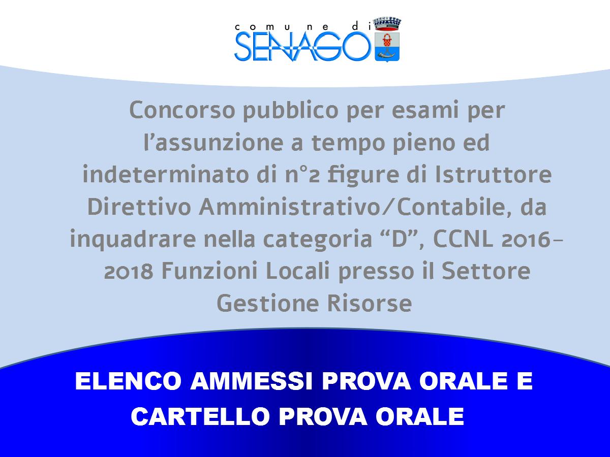 Elenco Ammessi alla Prova orale e Cartello Prova Orale CONCORSO PUBBLICO PER ESAMI, PER L’ASSUNZIONE A TEMPO PIENO ED INDETERMINATO DI N. 2 FIGURE DI ISTRUTTORE DIRETTIVI AMMINISTRATIVO/CONTABILE, DA INQUADRARE NELLA CATEGORIA “D”, CCNL 2016-2018, DA ASSEGNARE AL SETTORE GESTIONE RISORSE