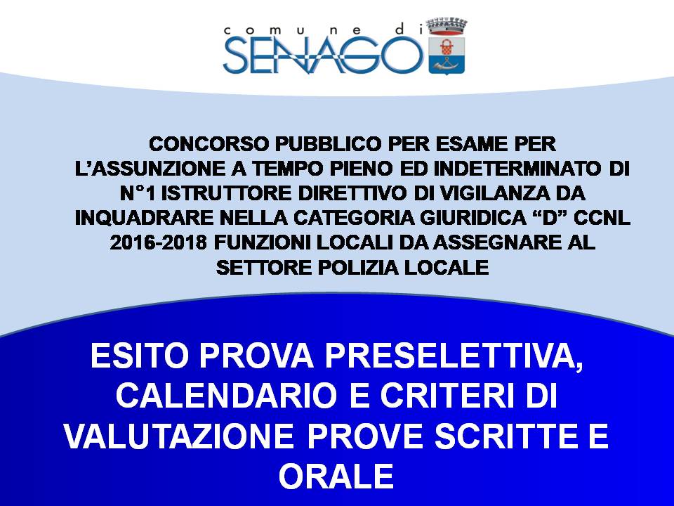 Esito prova preselettiva, Calendario e Criteri Prove Scritte e Orale per il concorso di esame n. 1 Istruttore Direttivo di Vigilanza Cat. “D”, da destinare al Settore di Polizia Locale
