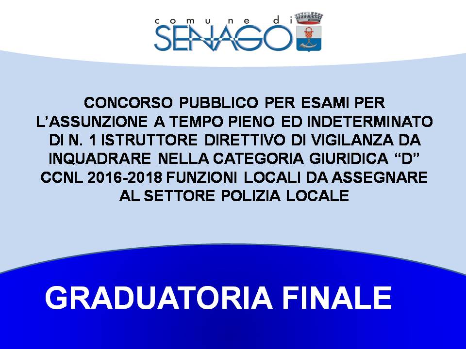 Si rende noto in allegato la graduatoria finale del concorso pubblico per esami per l’assunzione a tempo pieno ed indeterminato n. 1 Istruttore Direttivo di Vigilanza da inquadrare nella categoria giuridica “D” CCNL 2016-2018 Funzioni Locali da assegnare al settore Polizia Locale.