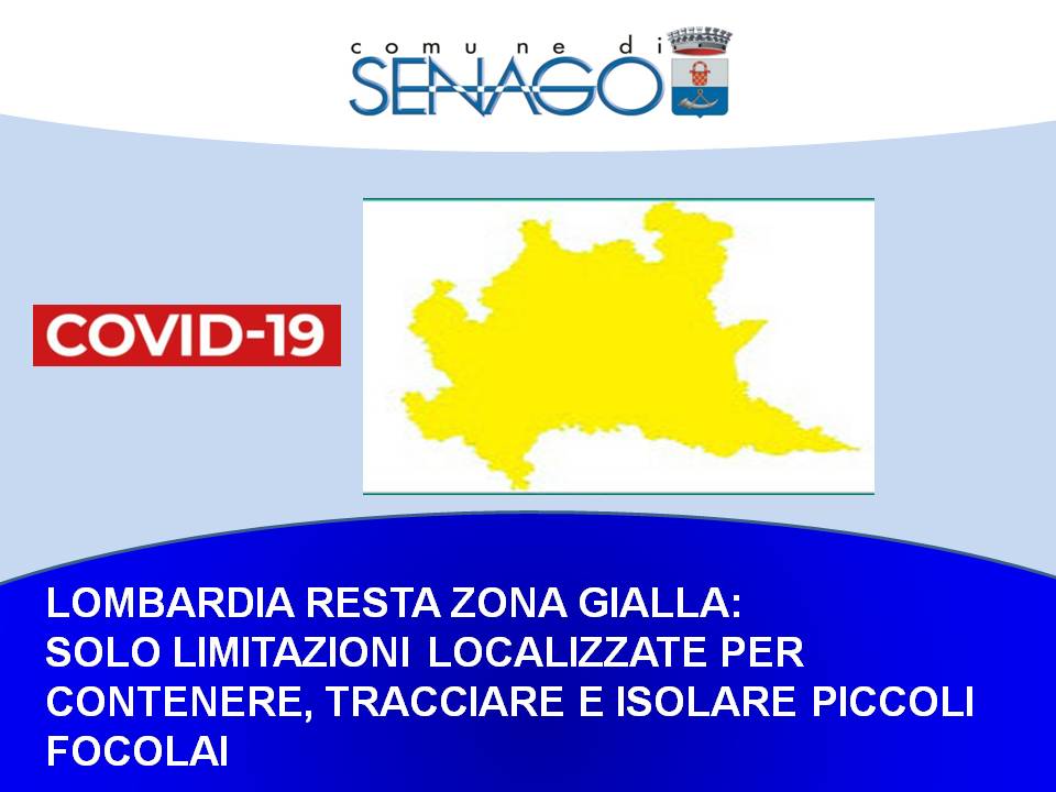 L’Amministrazione Comunale condivide l’informazione fornita da Regione Lombardia, in base alla valutazione degli ultimi dati Covid-19: la Lombardia rimane in zona gialla, resta pertanto attiva l’ordinanza firmata dal Ministro della Salute il 29 gennaio 2021. Per dettagli si rimanda al LINK