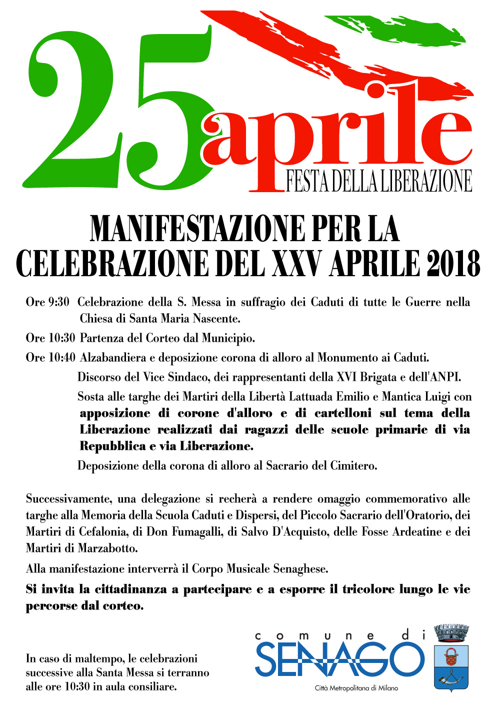 Ecco il programma della tradizionale manifestazione del 25 aprile, Festa della Liberazione.