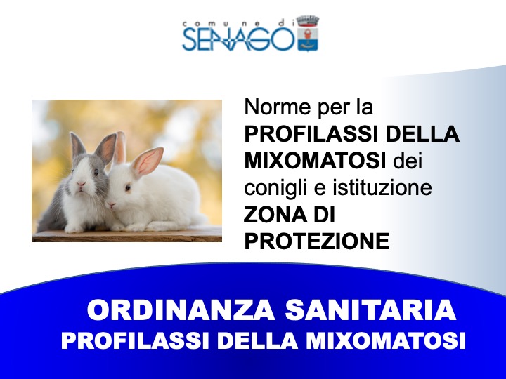Si rende nota, con decorrenza immediata, l’ordinanza sanitaria Prot. n. 0148310/22 del 09.09.2022, ad oggetto: “Zona di Protezione da Mixomatosi dei conigli” secondo cui viene istituita una Zona di Protezione ai fini della profilassi della Mixomatosi dei conigli su tutto il Distretto Veterinario della ATS Città Metropolitana di Milano, di Rho e di Nord Milano.