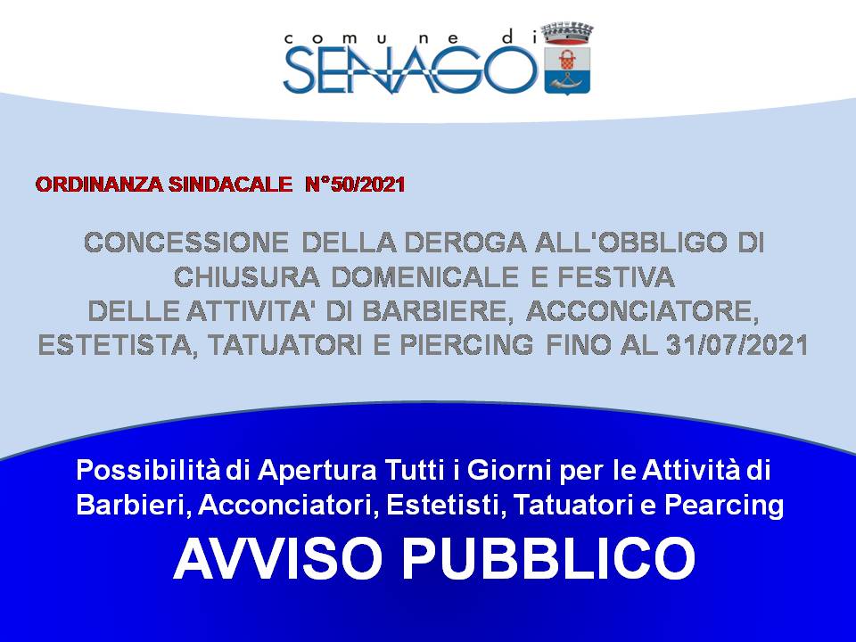 In sinergia con tutta l’Amministrazione Comunale, il Sindaco Magda Beretta ha firmato l’ordinanza n. 50 del 23 aprile 2021 con oggetto ” Concessione della Deroga all’ obbligo di Chiusura domenicale e festiva delle attività di barbiere, Acconciatore, Estetista, Tatuatori e piercing fino al 31/07/2021“che permette, in deroga al regolamento comunale, l’apertura FACOLTATIVA domenicale e festiva delle attività di barbiere, acconciatore, estetista, tatuaggio e piercing.