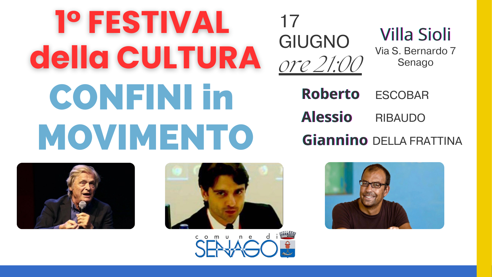 Il Comune di Senago presenta il Primo Festival della Cultura: “Confini in Movimento”, che si terrà nei giorni 13 – 15 – 17 Giugno 2023, in Villa Sioli, via S. Bernardo 7 a Senago.