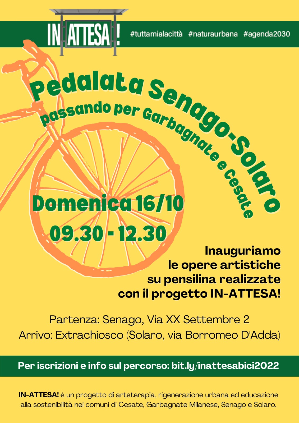 Progetto “IN-ATTESA”, sarà una pedalata inaugurale che si terrà domenica 16 Ottobre con partenza alle ore 9.30 dalla pensilina del bus di Via XX Settembre a Senago (di fronte al piazzale Aldo Moro) per poi fare tappa presso le altre pensiline delle fermate dei bus riqualificate a Garbagnate M.se, Cesate e Solaro, dove è previsto l’arrivo, intorno alle ore 12.30, presso l’Extrachiosco in via Borromeo d’Adda.