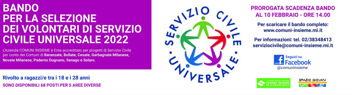 L’Azienda COMUNI INSIEME è Ente accreditato per progetti di Servizio Civile anche per conto dei Comuni di Baranzate, Bollate, Cesate, Garbagnate Milanese, Novate Milanese, Paderno Dugnano, Senago e Solaro e ha disponibili 5 progetti per complessivi 68 volontari.