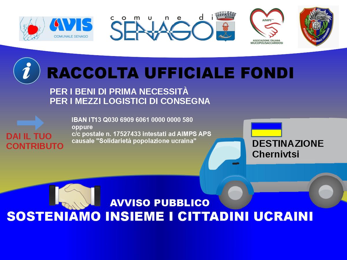 Comune di Senago, Associazione Italiana Mucopolisaccaridosi e Malattie Affini (AIMPS APS ), Associazione Nazionale Carabinieri Sezione di Senago (ANC) e Associazione Italiana volontari sangue (Avis Senago) insieme per aiutare e supportare la popolazione ucraina in difficoltà.