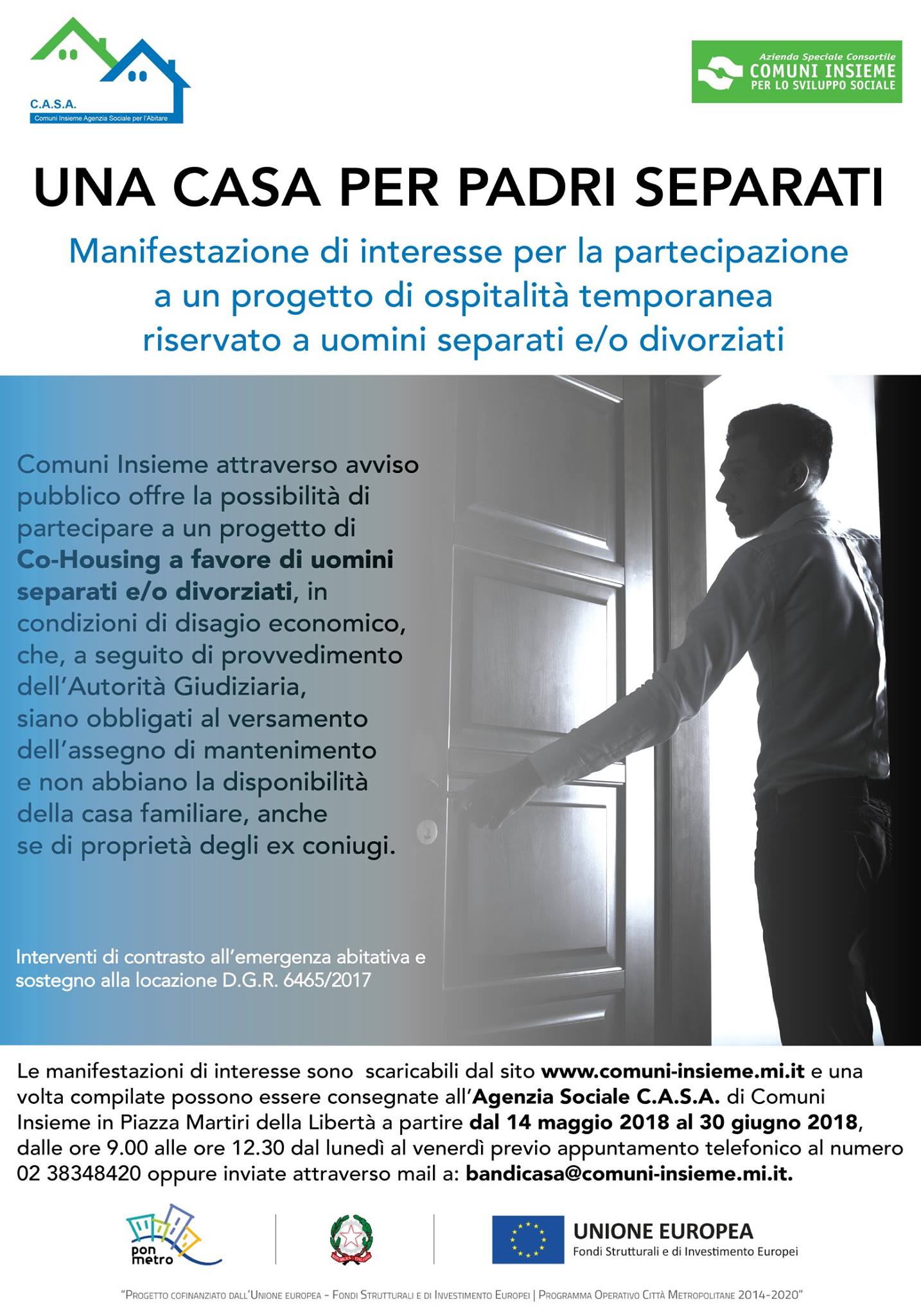 Comuni Insieme attraverso avviso pubblico offre la possibilità di partecipare a un progetto di Co-Housing a favore di uomini separati e/o divorziati, in condizioni di disagio economico che, a seguito di provvedimento dell’Autorità Giudiziaria, siano obbligati al versamento dell’assegno di mantenimento e non abbiano la disponibilità della casa familiare, anche se di proprietà degli ex coniugi.