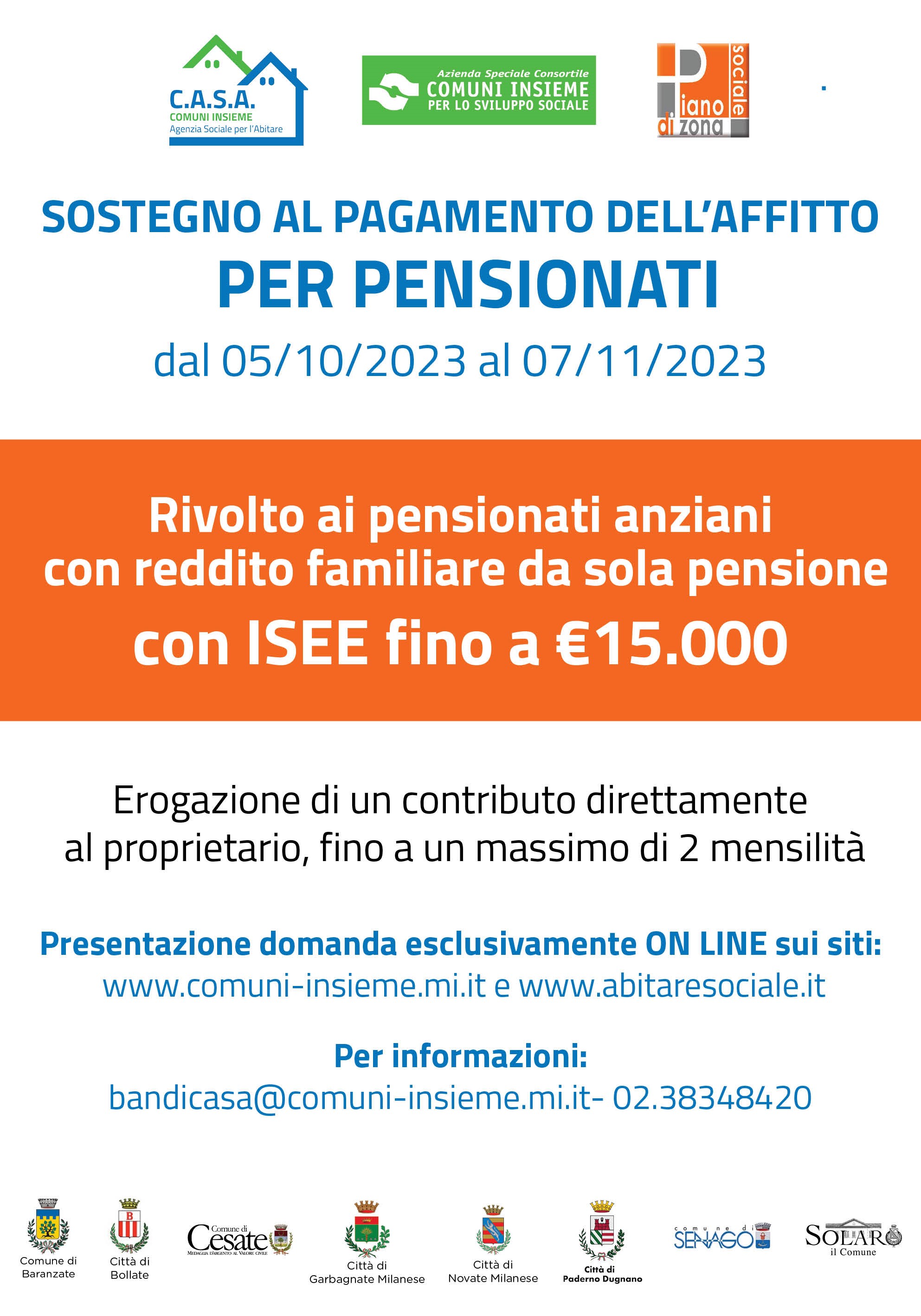 AVVISO PUBBLICO BANDO PER IL SOSTEGNO AL PAGAMENTO DELL’AFFITTO AGLI INQUILINI CON REDDITO COSTITUITO ESCLUSIVAMENTE DA PENSIONE-ANNO 2023