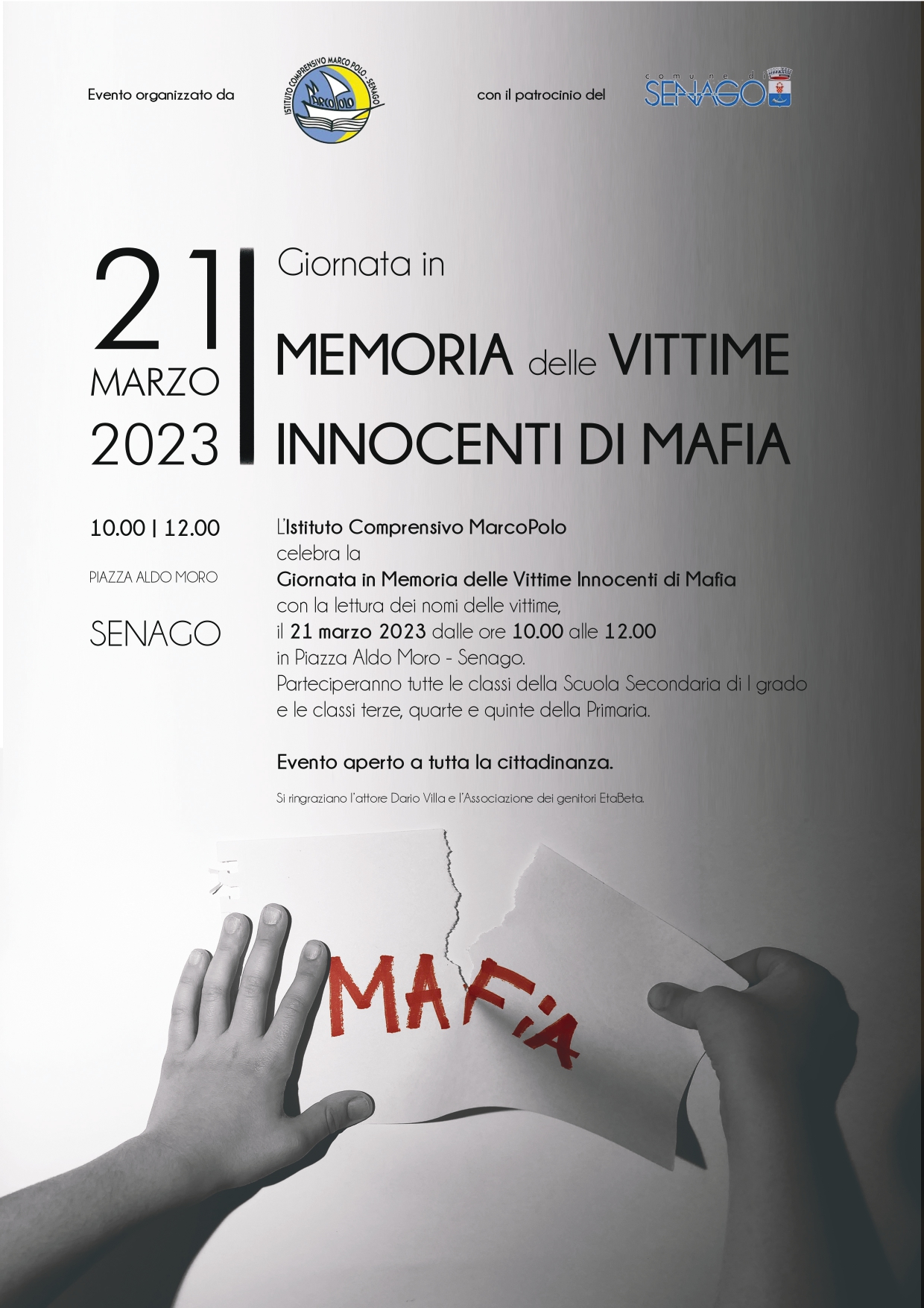 Nel corso della mattinata di martedì 21 marzo 2023, si è svolta la Giornata in Memoria delle Vittime Innocenti di Mafia, in Piazza Aldo Moro a Senago.