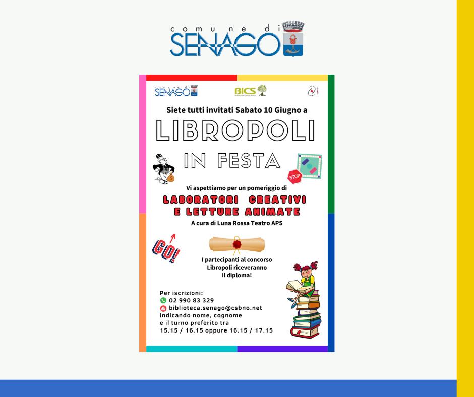 EVENTO BICS: LIBROPOLI IN FESTA Sabato 10 Giugno, Alla BICS Biblioteca Italo Calvino Senago di via Don Rocca 19, si prospetta un pomeriggio di letture e laboratori a cura di Luna Rossa Teatro APS I partecipanti al gioco Libropoli riceveranno il diploma! Per la buona riuscita della festa è necessario iscriversi indicando nome, cognome e turno preferito... Continua a leggere