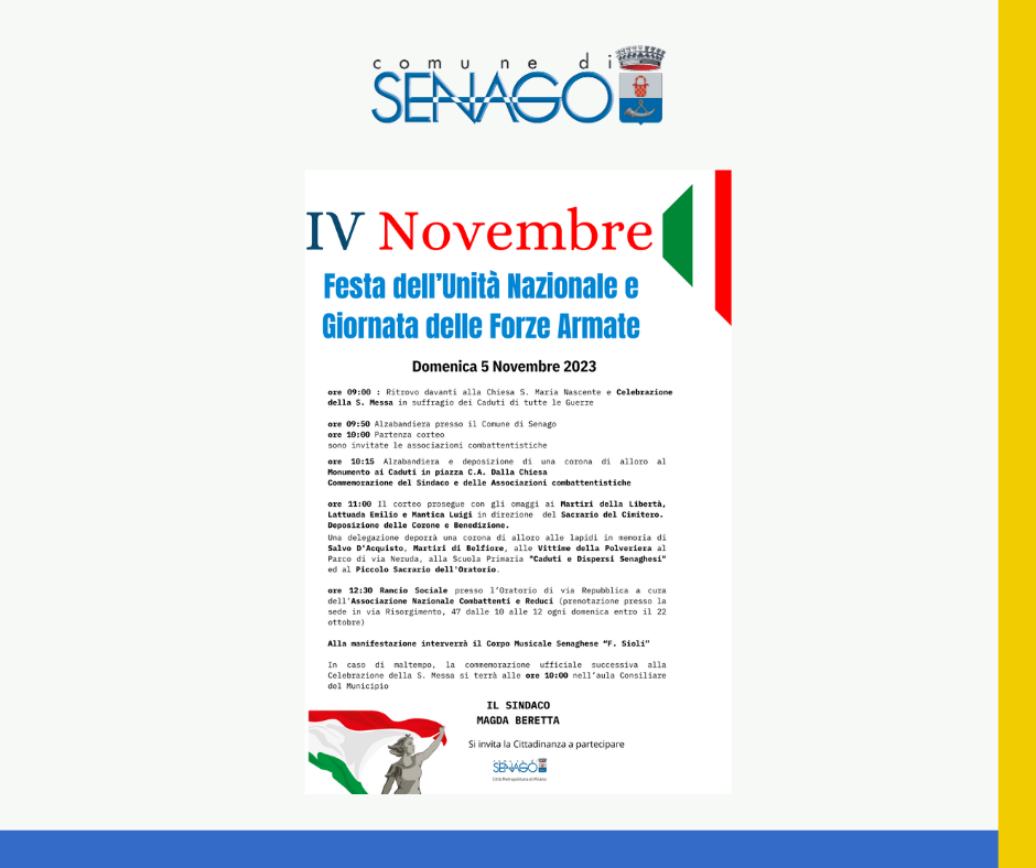 Domenica 5 Novembre 2023 si terranno le celebrazioni per la Giornata del 4 Novembre, dedicata alla Festa dell’Unità Nazionale e delle Forze Armate. L’Amministrazione invita tutta la cittadinanza a partecipare e a esporre il tricolore. Per partecipare al Rancio Sociale presso l’oratorio di via Repubblica dalle 12:30, a cura dell’Associazione Nazionale Combattenti e Reduci sezione di Senago,... Continua a leggere