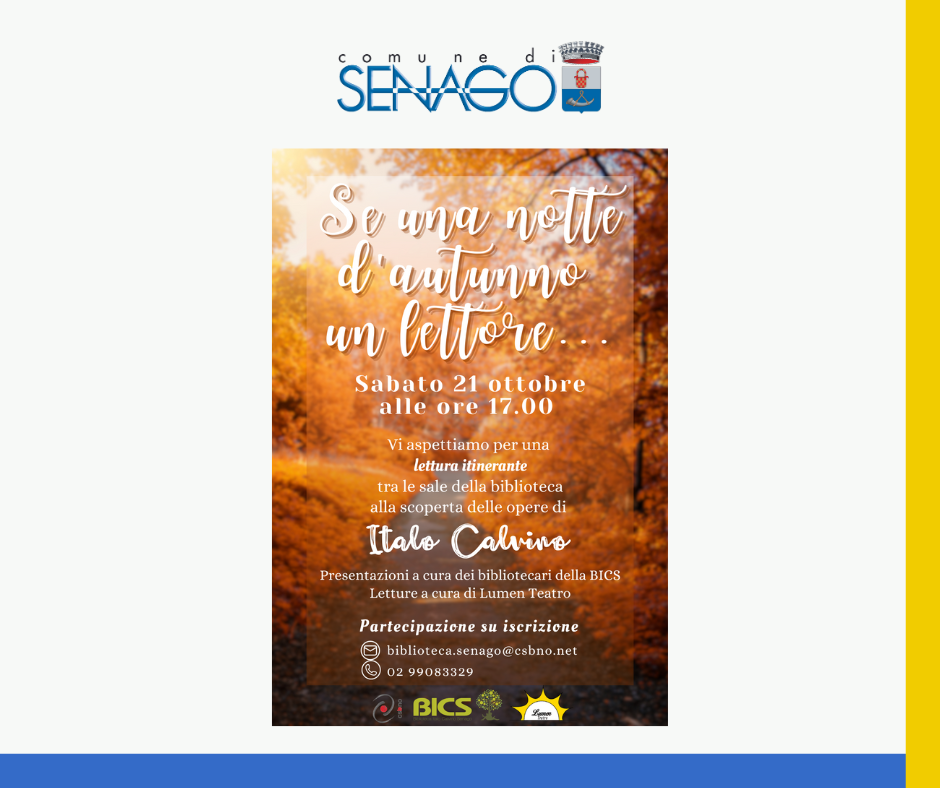 Biblioteca Italo Calvino Senago, presenta “SE UNA NOTTE D’AUTUNNO UN LETTORE…” Sabato 21 ottobre 2023 alle ore 17:00, in via Don Ambrogio Rocca, 19 Senago La BICS ospiterà una lettura itinerante, tra le sale della biblioteca, alla scoperta delle opere dell’autore in collaborazione con Lumen Teatro. L’evento è aperto per adulti e ragazzi, previa iscrizione tramite... Continua a leggere