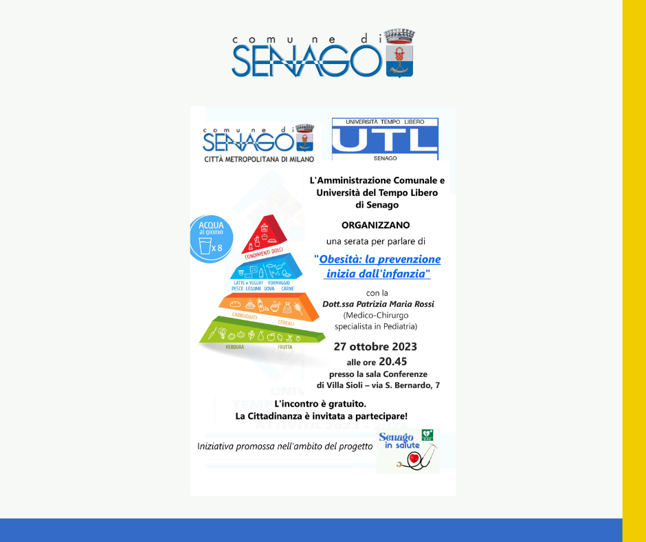 UTL Università del Tempo Libero Senago, in collaborazione con il Comune di Senago nell’ambito del progetto “Senago in Salute”, ORGANIZZANO “Obesità: la prevenzione inizia dall’infanzia” Dott.ssa Patrizia Maria Rossi (Medico-Chirurgo specialista in Pediatria) 27 ottobre 2023 alle ore 20.45 presso la sala Conferenze di Villa Sioli Gli incontri sono gratuiti e aperti alla cittadinanza